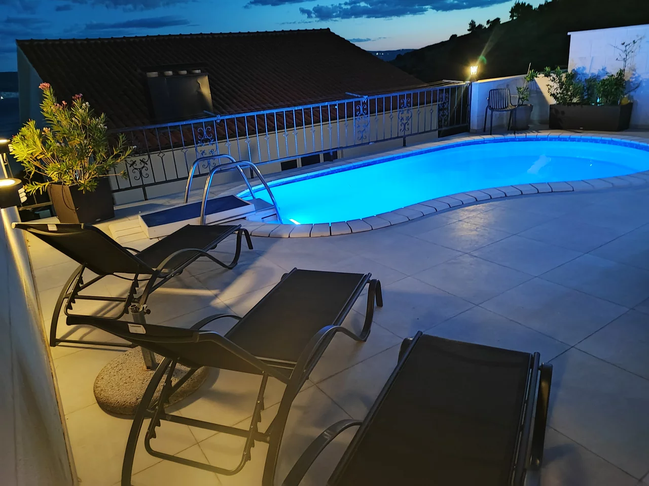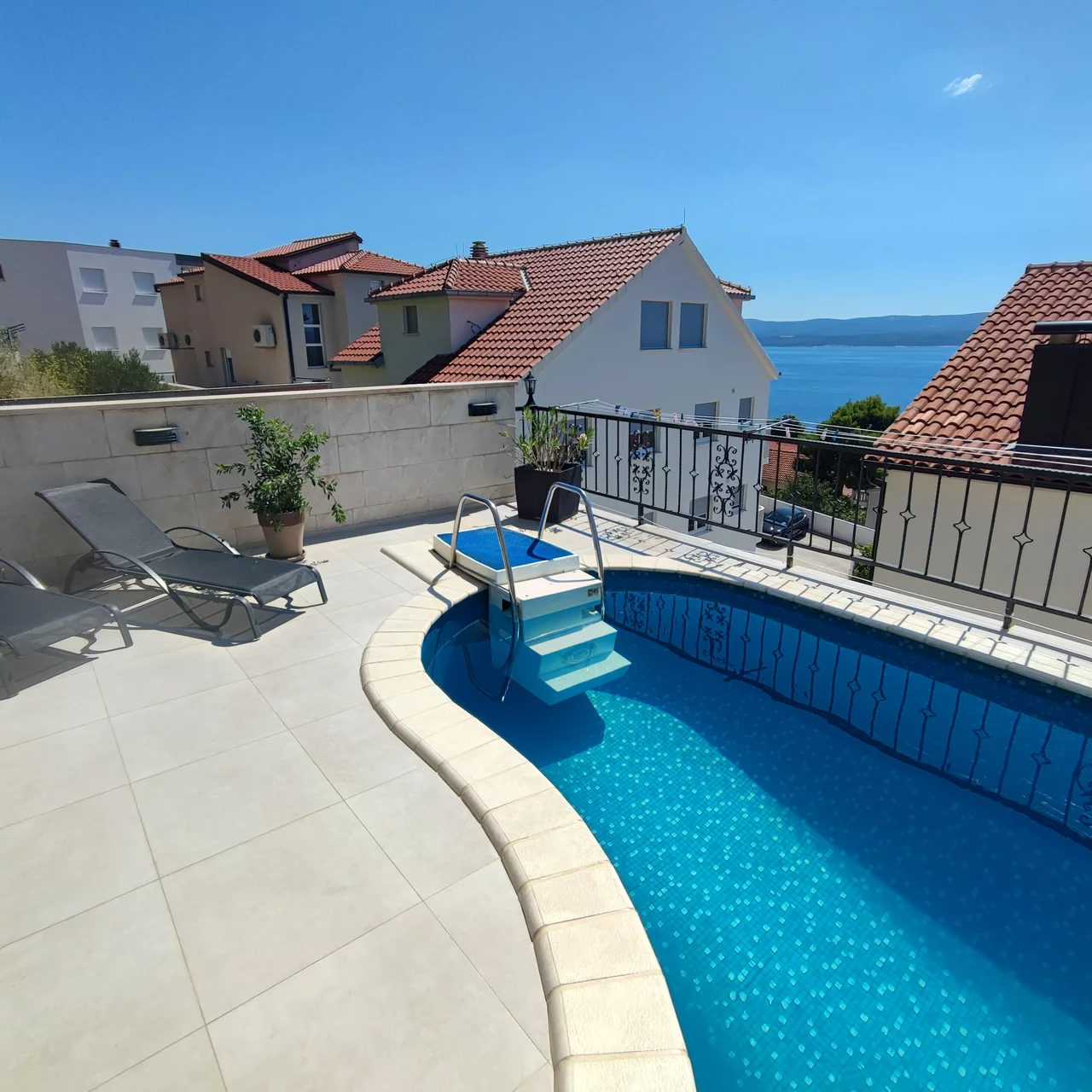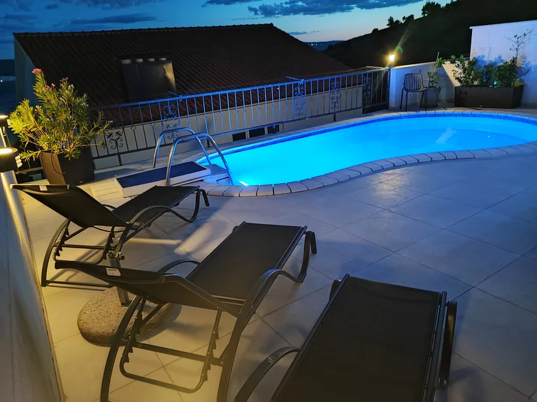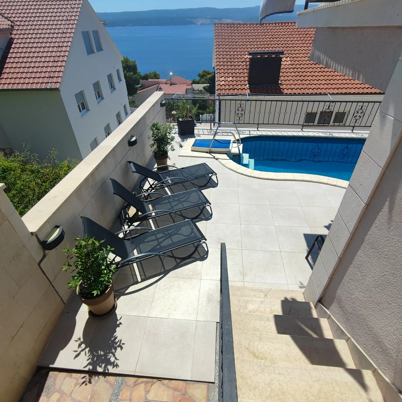 Die Veranda des Appartemets befindet sich direkt vor dem Pool und lädt zum gemütlichen Frühstück ebenso ein, wie die Sonnenliegen zum Entspannen.