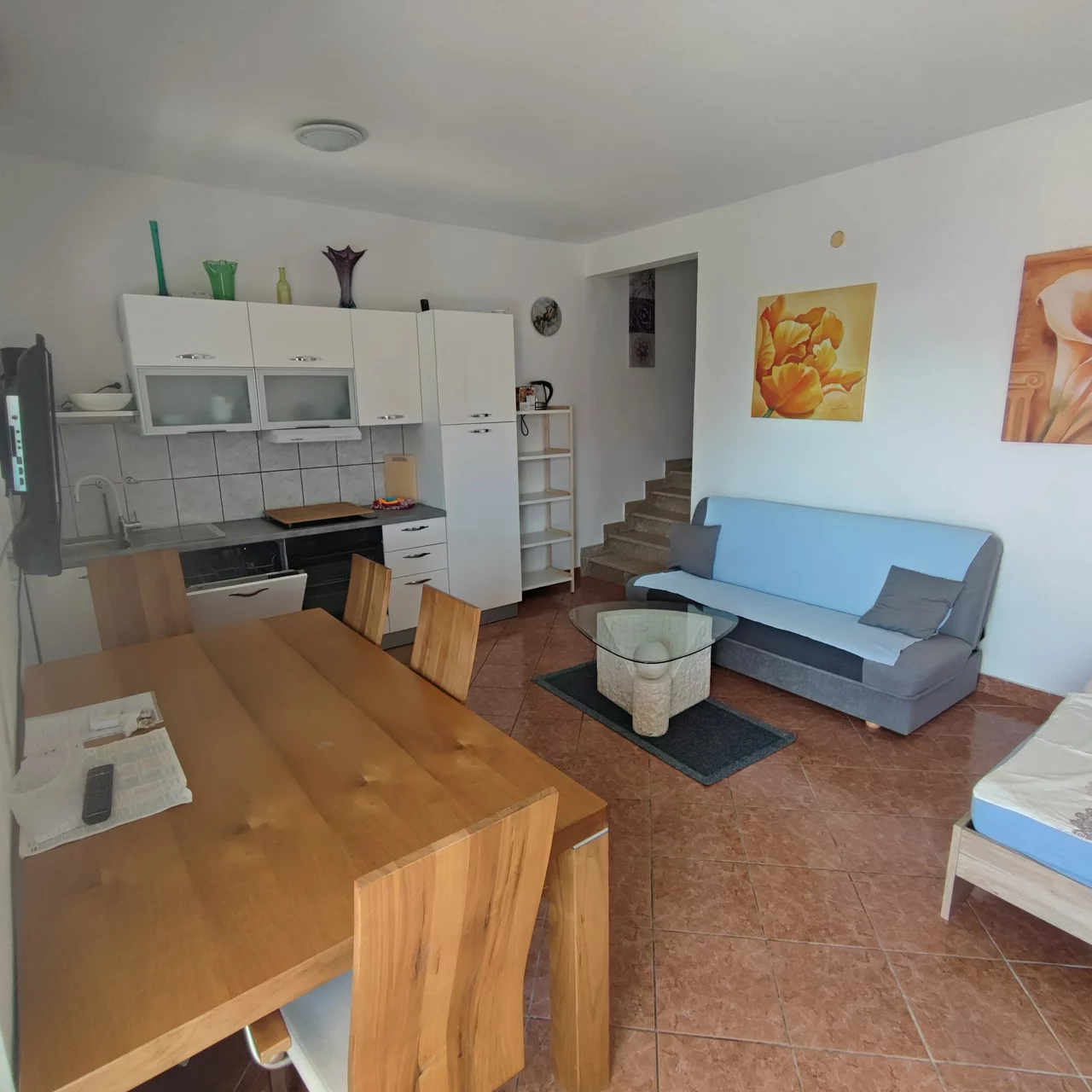Im Wohnraum befindet sich eine Schlafcouch mit Meerblick und eine kleine Küche.
