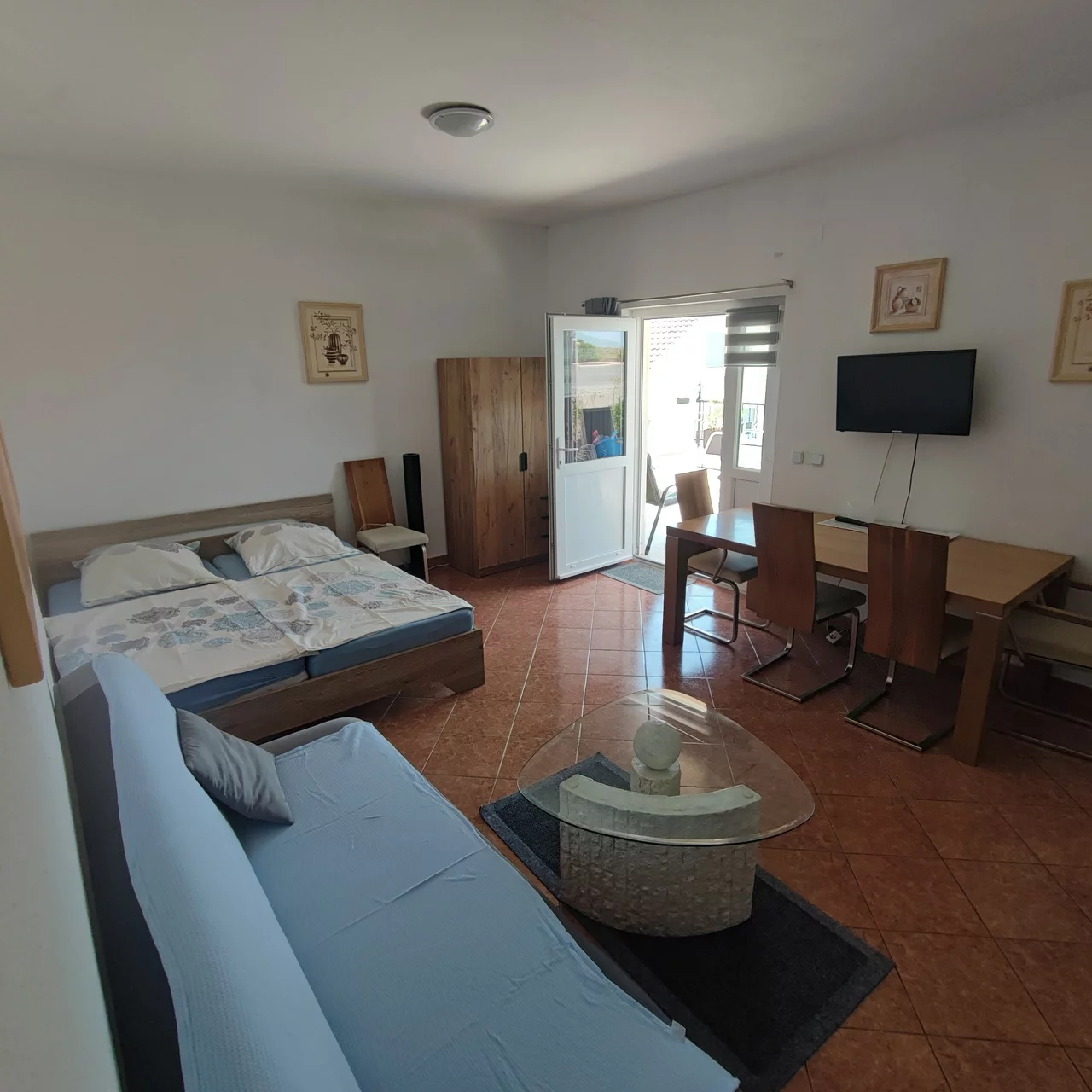 Appartment I verfügt über ein getrenntes Schlafzimmer mit Doppelbett sowie einen begehbaren Kleiderschrank. Dazu gibt es im Hauptraum eine kleine Küche sowie ein zweites Doppelbett mit Meerblick und eine Schlafcouch.